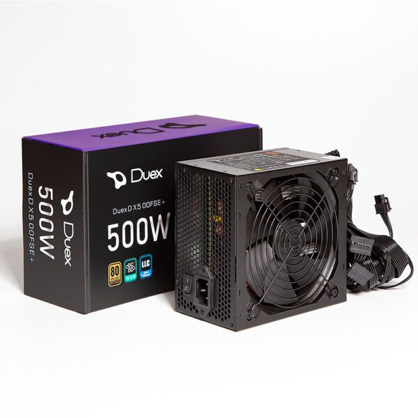 A Fonte DX 500FSE+ oferece 500W de potência com certificação 80 Plus Bronze e PFC ativo, unindo eficiência energética e estilo com iluminação. Possui conectores 20+4 pinos, ATX 12V, 2x PCIE, 4x SATA e 2x Molex, além de entrada automática 115V/230V, ideal para setups personalizados.